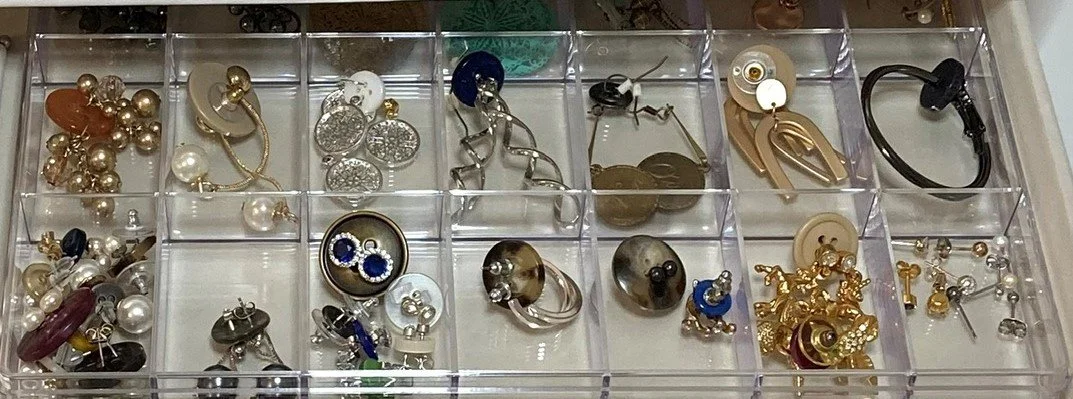 After grouping pieces by type, style, or material, I use clear trays with multiple, small compartments to hold them all. Large or unique earrings can go into their own space. Several pairs of studs can be kept together. Whatever system makes sense to you, follow it. This is also good for things like pins or small keepsake items.