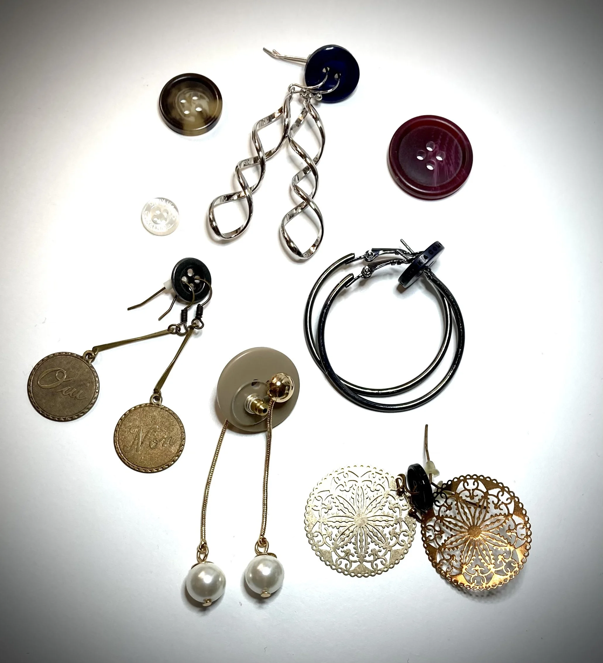 You know how sometimes you buy a shirt, and it comes with an extra button or two? Well, I take them off the shirt and put them right into my jewelry box. I simply thread the earring posts through the buttonholes, attach the backs, and voila! An inseparable pair. When it’s time to wear the earrings, I just pop them off the button, and then I make sure to put them back when finished. And if I ever do need a particular button for a shirt repair, then I simply pull out the matching button from my earring collection and find a different button to use for the earrings. Don’t worry if you haven’t been saving your random buttons for reuse – a bag of buttons can be purchased for a few dollars.